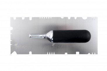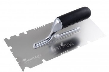 La caratteristica principale è la lama dello stesso acciaio di Xtrowel, con spessore mm. 0,6, sagomata su tre lati, con motivi diversi che sono accuratamente calibrati per aumentarne la versatilità: è sufficiente modificare inclinazione, verso del movimento e pressione per ottenere quello che la mano del professionista desidera in quel momento.
